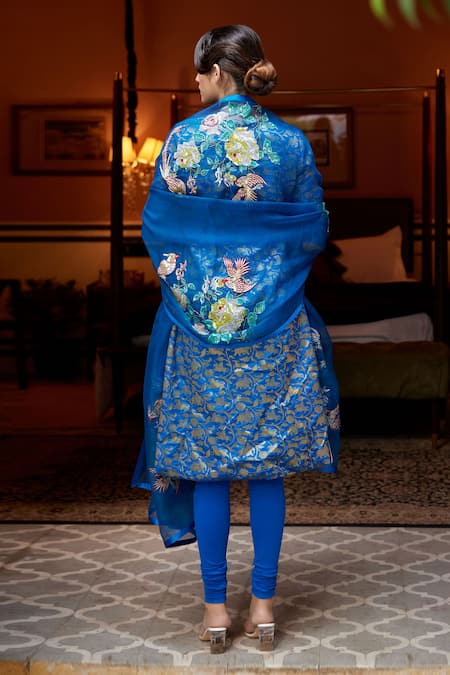 Cobalt blue banarasi brocade kurta featuring a V-neckline and short sleeves. Paired with silk satin churidar and an embroidered silk organza dupatta adorned with floral and bird motifs.