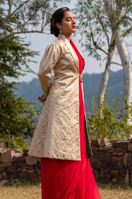 Blush pink long jacket with Shikaargah brocade, lined with forest green silk.