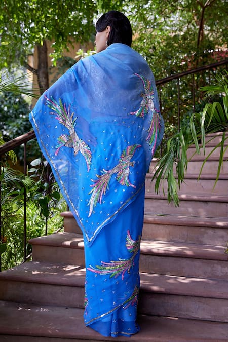 Sky blue ombre saree featuring multicolor bird, sequin, and aari embroidery. Comes with an unstitched blouse piece in silk satin.