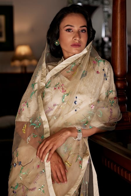 Off-white silk organza saree with Swarovski tube beads, sequin embroidered floral motifs. Comes with unstitched blouse.