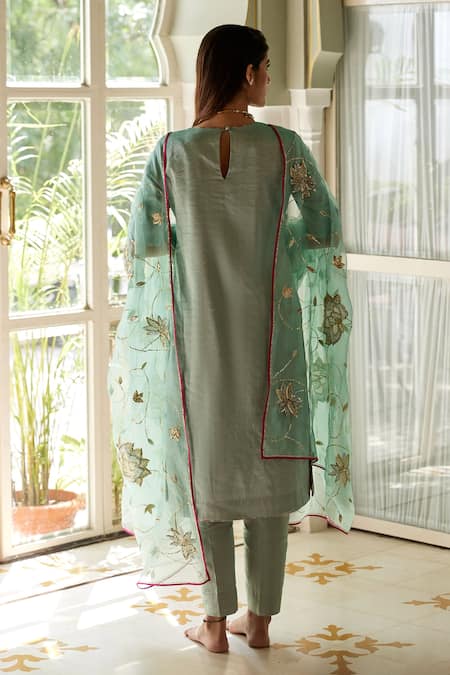 Mint green kurta featuring a V-neckline and short sleeves. Paired with matching pant and a heavily embroidered dupatta in silk organza with floral motifs.