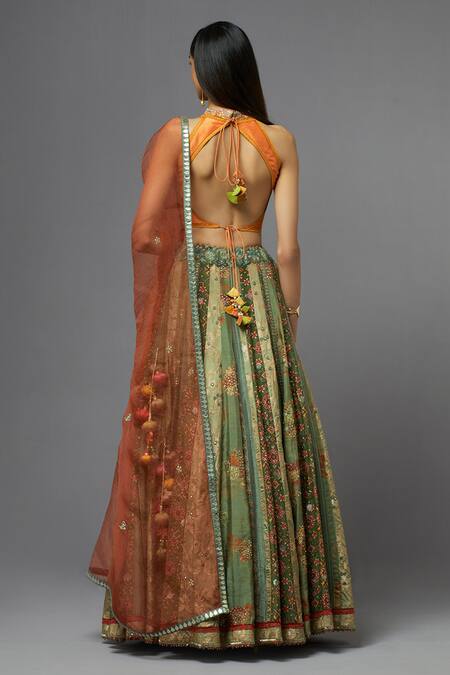 Green Silk Embroidered Floral Halter Blouse Lehenga Set
