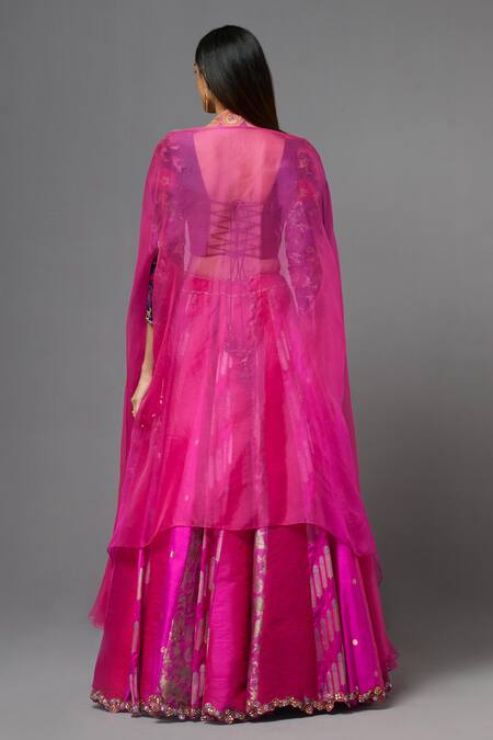 Fuchsia Silk Embroidery Square Neck Floral Cape Lehenga Set