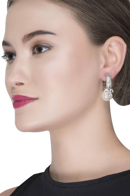 Silver hued earrings featuring crystal embellishments and a bead drop design