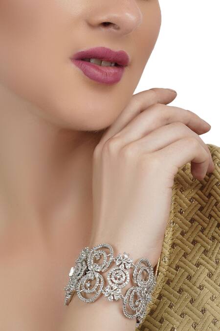 Silver bracelet featuring encrusted diamante stones and intricate designs
