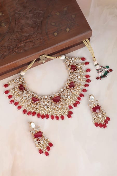 Buy_Auraa Trends_Red Beads, Diamonds Carved Cutwork Necklace Set _at_Aza_Fashions