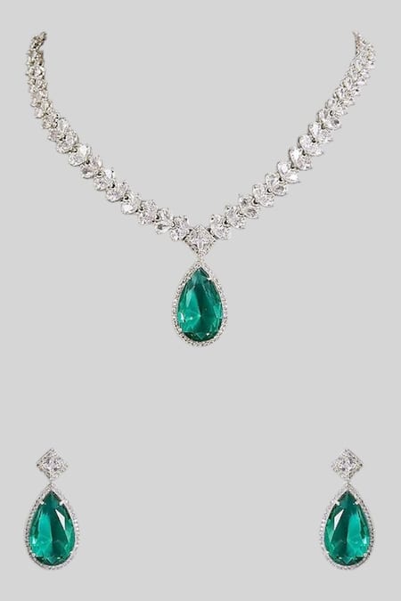 A green diamond-cut zircon necklace featuring a teardrop pendant and studded with cubic zirconia stones in rhodium plating. It is paired with matching teardrop earrings.