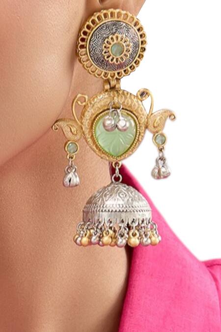 Green dual tone jhumka earrings crafted from mixed metal, featuring a carved green stone accent and gold & oxidized silver finish.
