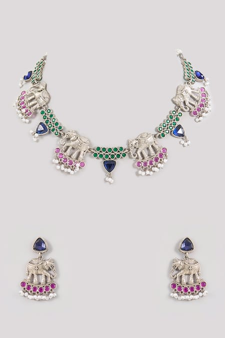 Multi color choker set featuring intricate elephant motifs with sparkling stones and enamel work. Complemented by matching earrings adorned with sapphire-blue stones.