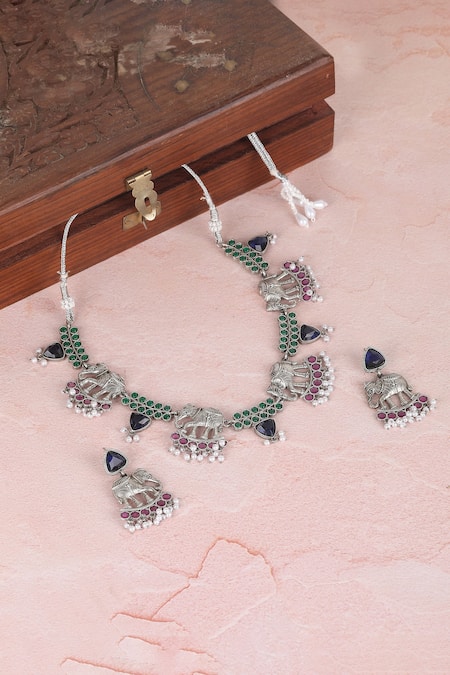 Silver tone choker featuring elephant motifs, pearl tassels, and green-multicolour stone embellishments. Paired with matching earrings adorned with similar stone details.
