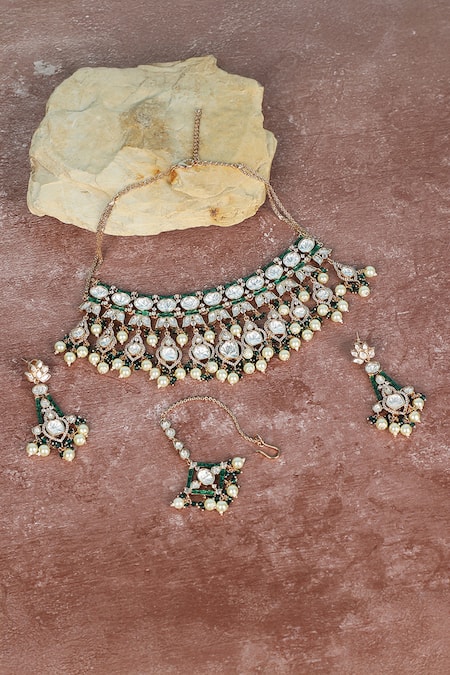 Gold finish necklace featuring uncut polki stone embellishments and emerald green enamel work. Paired with matching earrings and maangtikka for a complete look.
