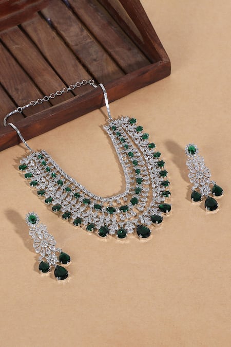 Silver necklace featuring faux diamonds and emerald stones. Paired with matching earrings embellished with the same stones.