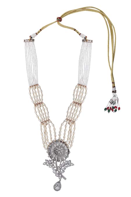 Shop_Auraa Trends_White Stones Floral Carved Pendant Necklace Set _Online_at_Aza_Fashions