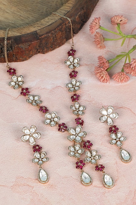 Buy_Auraa Trends_Red Stones, Rhinestones Floral Shaped Pendant Necklace Set _Online_at_Aza_Fashions