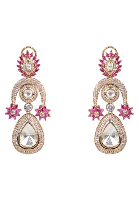 Pink Stones, Crystals, Gold-plated Teardrop Kundan Earrings