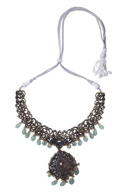 Green Beads, Zari, Diamonds American Pendant Necklace Set