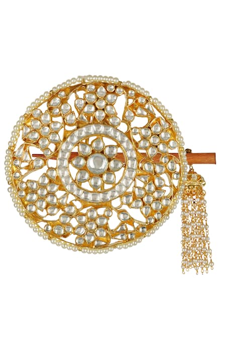 Intricate kundan motifs, Pearl rim detailing, Wooden stick with pearl strings