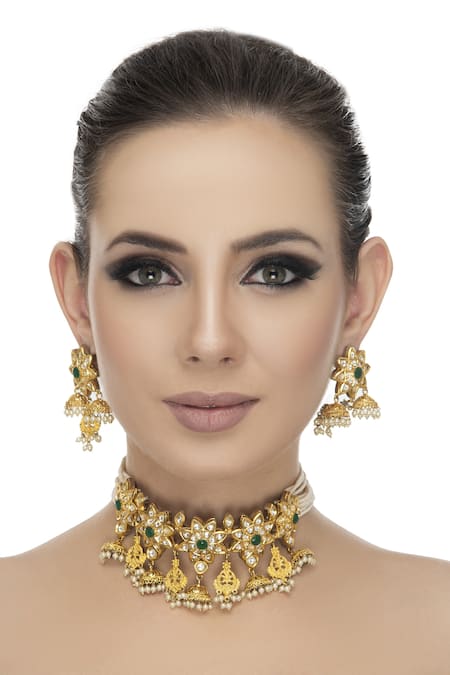 Gold plated choker featuring embellished stones and bead drop detail. Paired with floral earrings, both showcasing intricate dome carving.