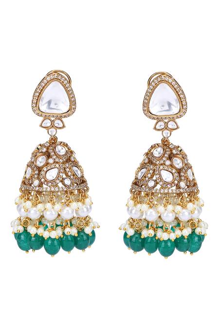 Gold plated with intricate kundan work, Drop embellishments with green stones, Dori tie-up closure for adjustable fit