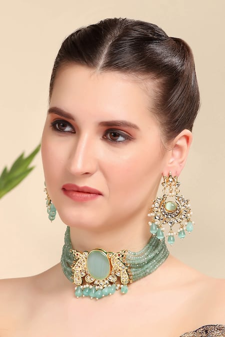 Gold choker featuring a green stone centerpiece adorned with kundan and beaded strands. Accompanied by matching dangler earrings with similar embellishments.