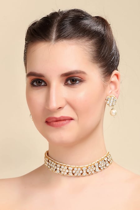 Kundan embellishments with pearl accents, Oval motifs on choker, Hook closure for secure fit