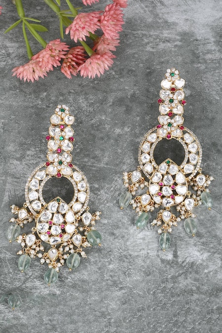 22kt gold plated earrings featuring geometric cutwork pattern and kundan embellishments