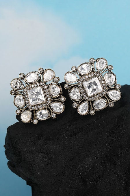 Silver finish square shaped stud earrings featuring white kundan and stone embellishments