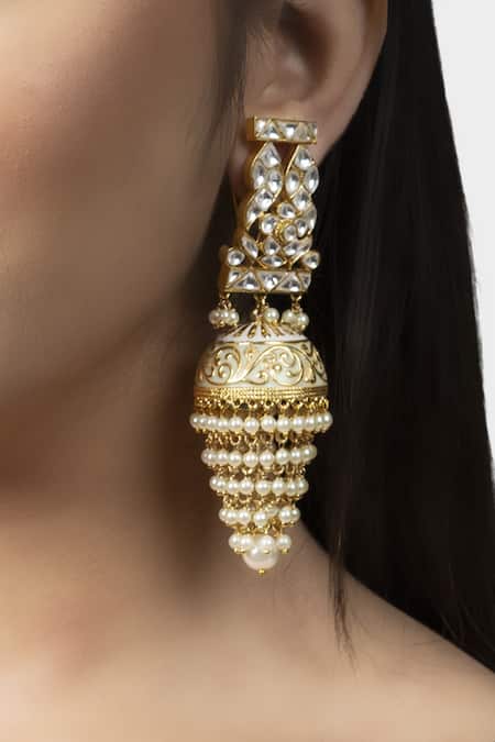 Gold plated jhumkas featuring intricate kundan and polki embellishments with elegant pearl drops