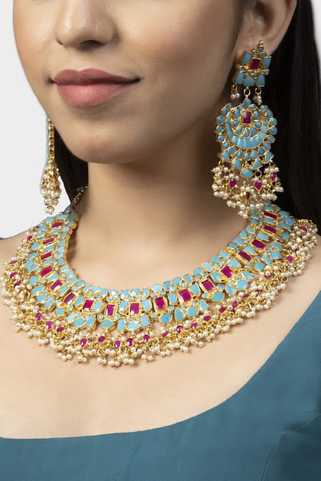 Turquoise kundan and polki embellishments, Pearl drop details, Gold plating finish
