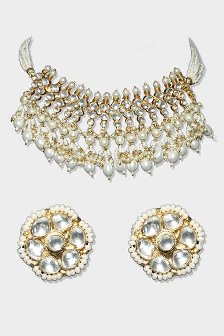 Gold plated necklace featuring kundan, polki embellishments with white bead drops. Paired with floral stud earrings for a complete look.