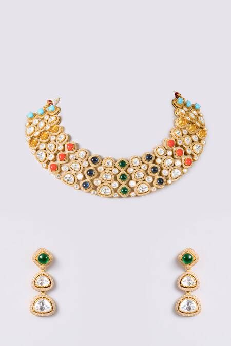 Navratna stone embellishments, Kundan polki stone work, Gold finish mixed metal setting