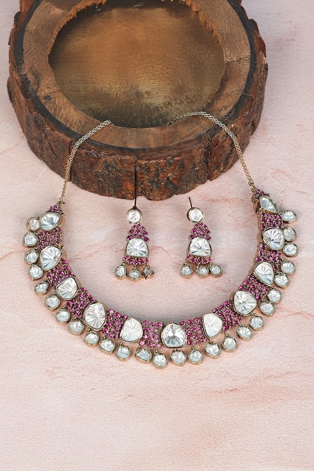 Gold finish necklace featuring uncut kundan stones and ruby embellishments. Paired with matching chandelier earrings adorned with similar detailing.