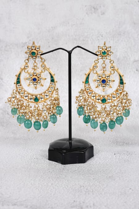 Stone drops hanging from the base, Intricate floral motifs, Kundan encrusted design