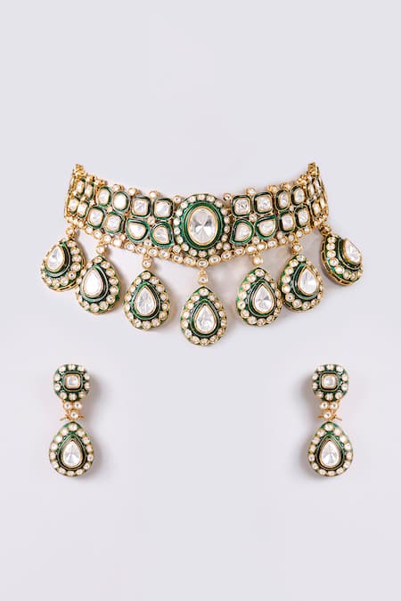 A green Kundan choker necklace crafted from mix metal, featuring intricate Kundan stones, tear-drop motifs, and green enamel accents. It is paired with coordinated tear-drop shaped stud earrings.