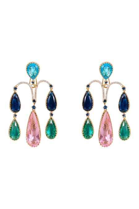 A pair of gold-plated statement earrings crafted from mixed metal, featuring a multi-color design with teardrop-shaped stones in shades of blue, pink, and green.