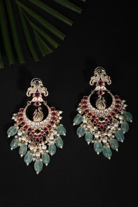Buy_Auraa Trends_Red Stones, Beads, Zari Peacock Carved Earrings _at_Aza_Fashions