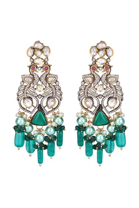 Green peacock feather embellished necklace featuring kundan and stone details. Paired with matching drop earrings adorned with similar embellishments.