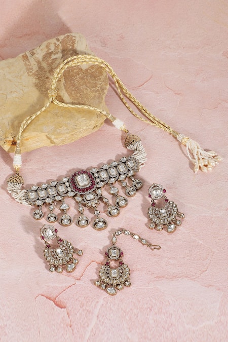 Silver finish with polki stones, Red ruby stone accents, Intricate choker design