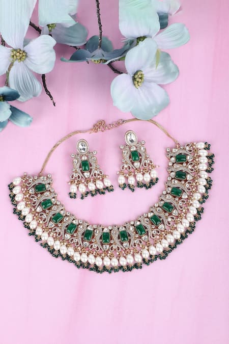 Buy_Auraa Trends_Green Stones, Zari And Kundan Embellished Necklace Set _Online_at_Aza_Fashions