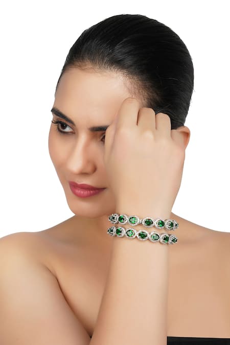 Silver bracelet featuring geometric motifs adorned with green diamante stones