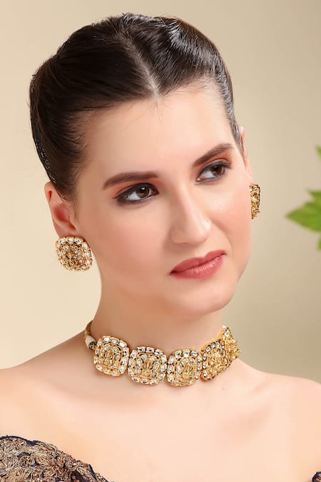 Gold choker featuring intricate kundan embellishments and temple motifs. Paired with matching stud earrings for a complete look.