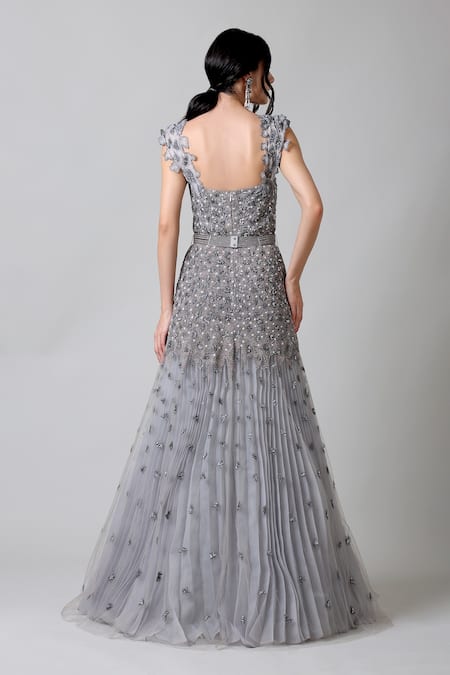 Silver, grey sleeveless gown with delicate bead and pearl embroidery all-over on the bodice and pleats along with a layer of tulle at the bottom. Comes with a belt.