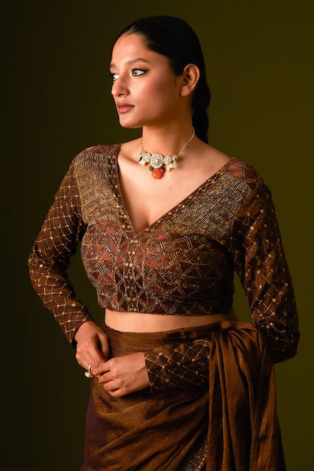 Brown cotton zari silk saree featuring antique gold aari & zardozi embroidery. Paired with a long sleeve V neck blouse adorned with zari thread, beads & sequins.
