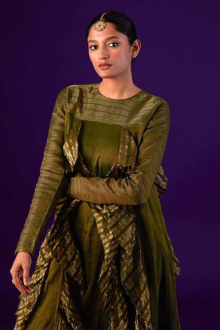 Green Cotton, Silk Zari Round Neck Striped Frill Godets Anarkali