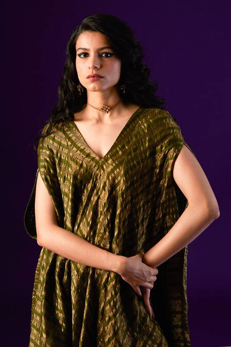 Dark green poncho kurta featuring zari stripes, V neckline, and poncho sleeves. Paired with straight pants for a complete look.