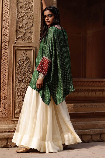 Green kaftan featuring dori and gota embroidery with a round neckline and flared sleeves. Paired with a contrast white sharara featuring a flowy silhouette.