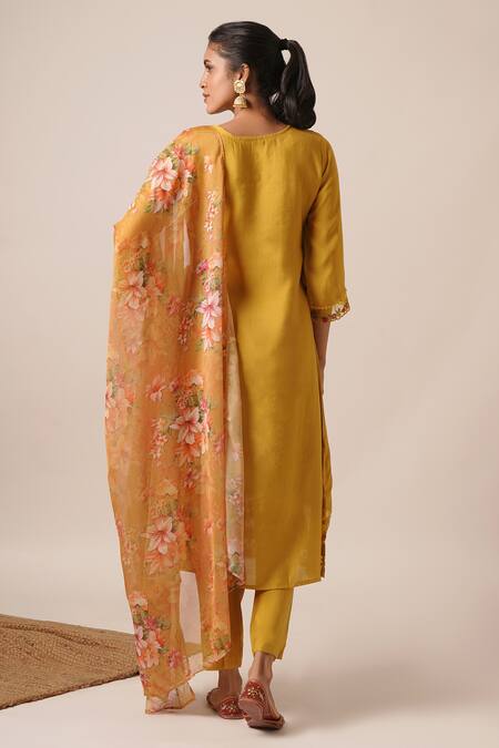 Buy_Tuli_Yellow Viscose, Silk, Chiffon Embroidery Round Floral Straight Kurta And Pant Set_at_Aza_Fashions