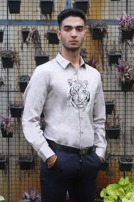 Grey Cotton Blend Handpainted Tiger Daniel Shirt