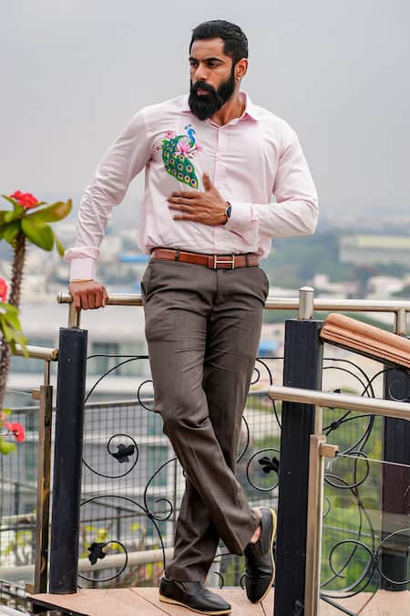 Peach Cotton Blend Hand Painted Mayur Motif Button Down Shirt