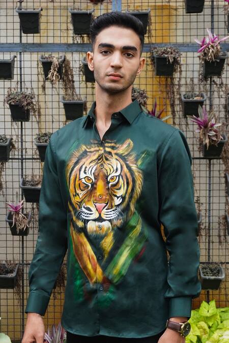 Green Cotton Blend Handpainted Tiger Motif Shirt